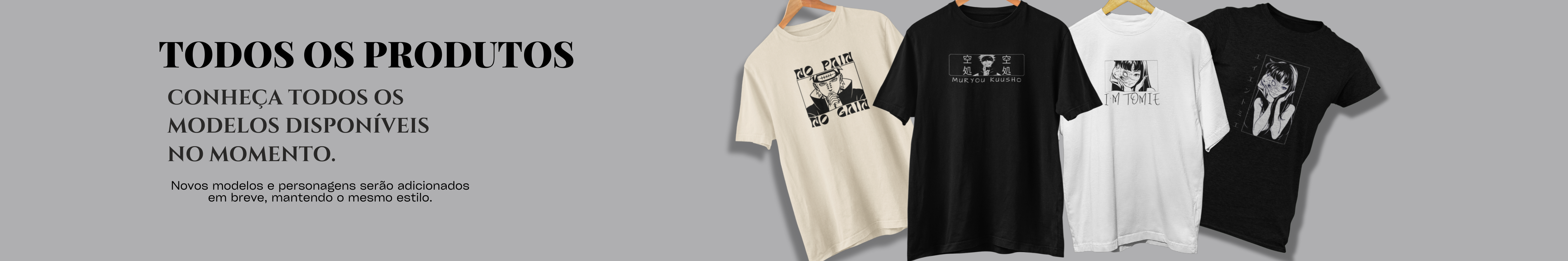 Todos os modelos da Ani Vibe reunidos em um só lugar. Novas camisetas e personagens serão adicionados em breve, mantendo o mesmo estilo minimalista.